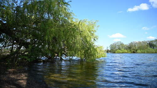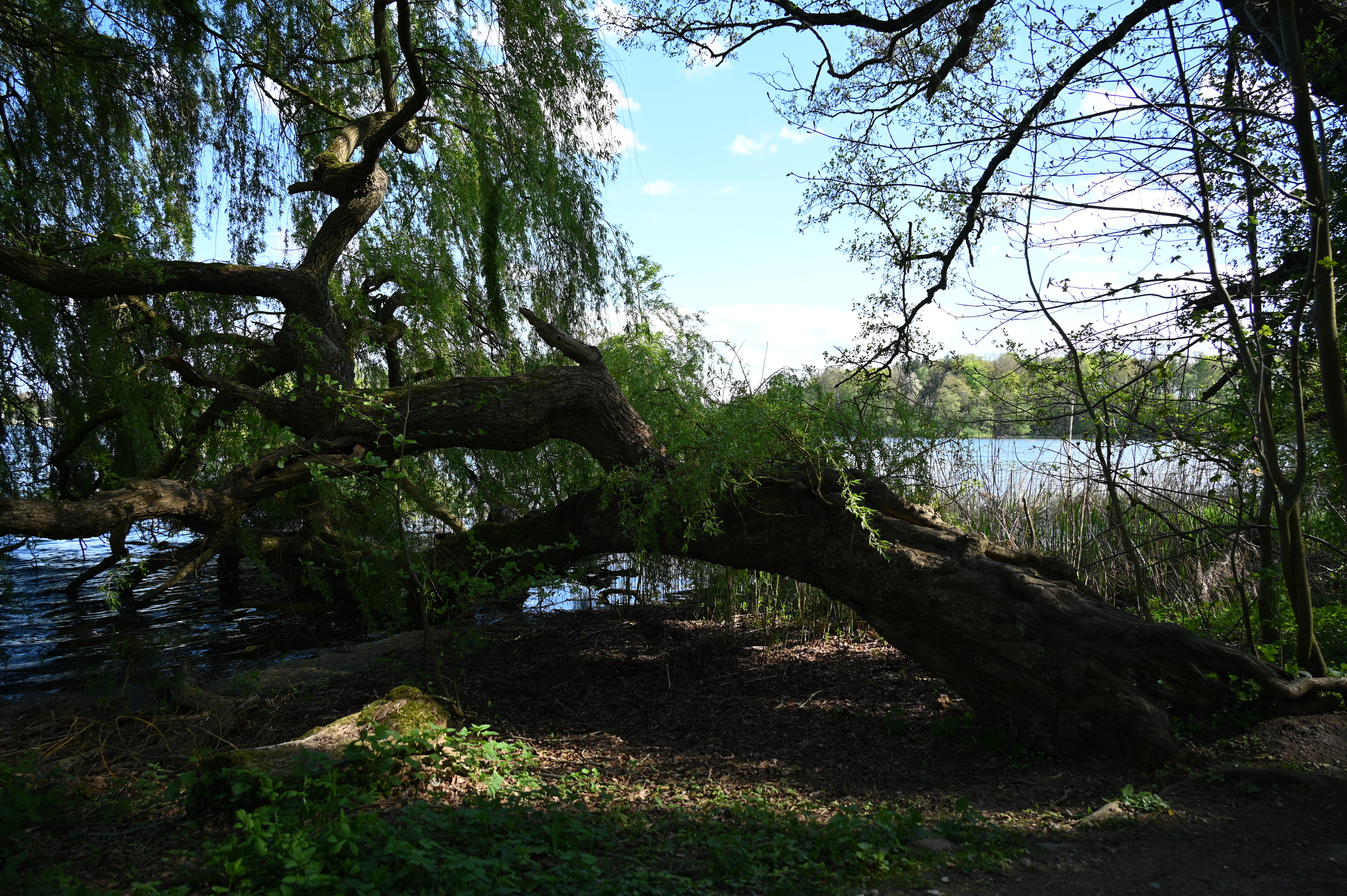 Ein umgestürtzter aber noch lebender Baum ragt in den See. Blickrichtung: Südosten Datum: 26.04.2025