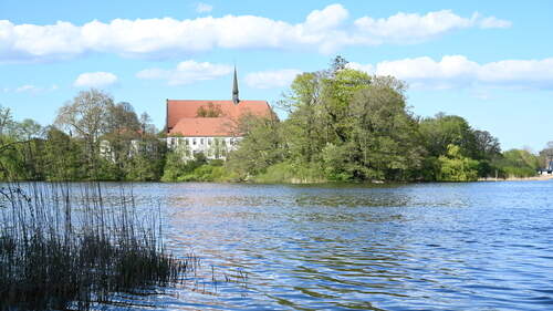 Blick über den nördlichen Teil des Bordesholmer Sees auf das Kloster. Blickrichtung: Norden Datum: 26.04.2025