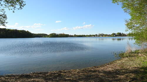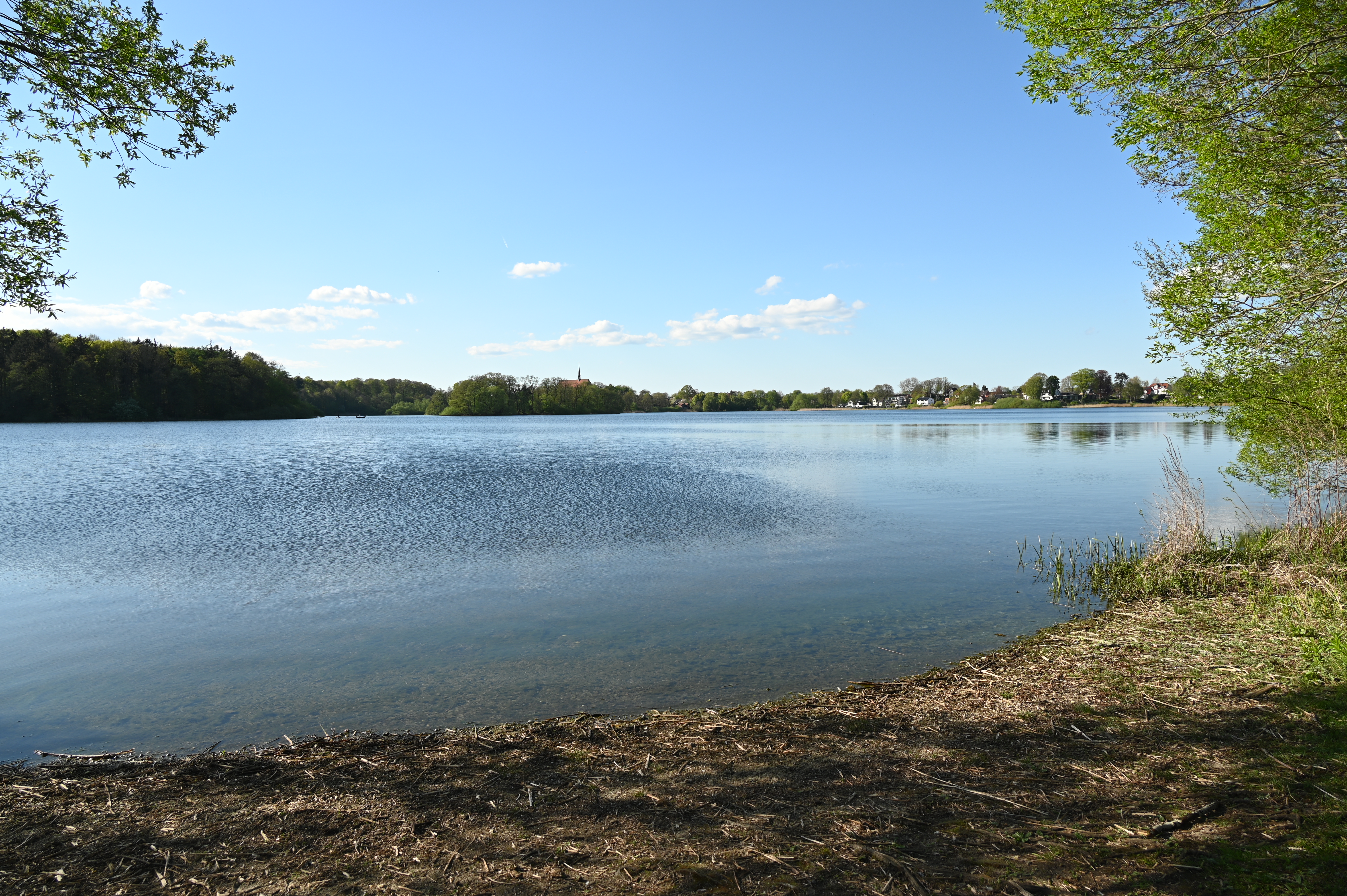 Blick über den Bordesholmer See mit Kloster und Wohnhäusern am entfernten Ufer. Blickrichtung: Nordwesten Datum: 26.04.2025