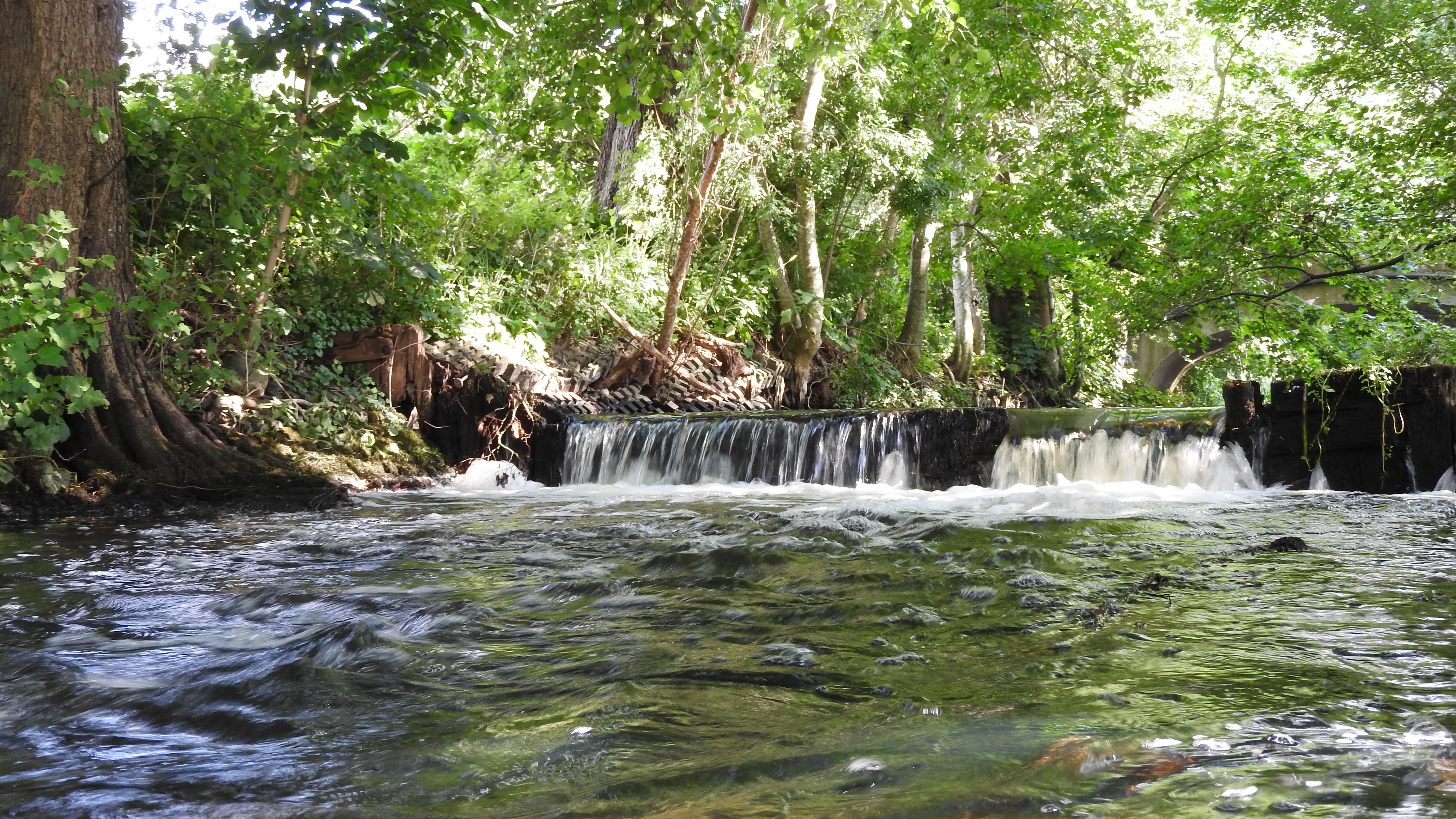 Ein kleiner künstlicher Wasserfall im Lauf der Eider bei der Steinfurter Mühle Blickrichtung: Südosten Datum: 11.08.2023